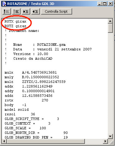 Inseriamo, all’inizio del testo, 2 nuove righe di comando: “ROTX girax” e “ROTZ giraz”